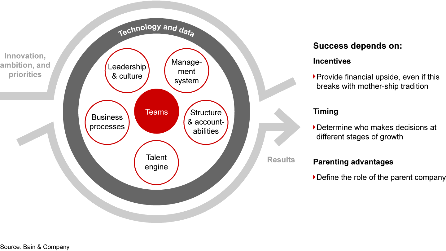Still, competing for talent with start-ups, tech firms, and insurgent brands has not been easy for traditional companies. Experienced innovation talent who like to move fast and make a big impact may hesitate to join corporations they view as bureaucratic, slow, or inflexible. Companies can alter the balance in the talent war if they can back their commitment to ROI with an operating model that harnesses the best of both worlds: a start-up venture culture and the scale parenting advantages of the mother ship (see Figure 4). That means getting incentives, timing, and the role of the parent company right.