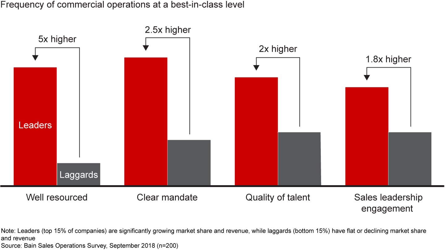 Eine Studie von Bain hat ergeben, dass führende B2B-Unternehmen – definiert nach Umsatz- und Marktanteilswachstum – beim Thema Commercial Operations deutlich weiter sind als der Wettbewerb. Das gilt insbesondere in Bezug auf die Qualität ihrer Mitarbeiter und ihre digitale Kompetenz (Abbildung 1).