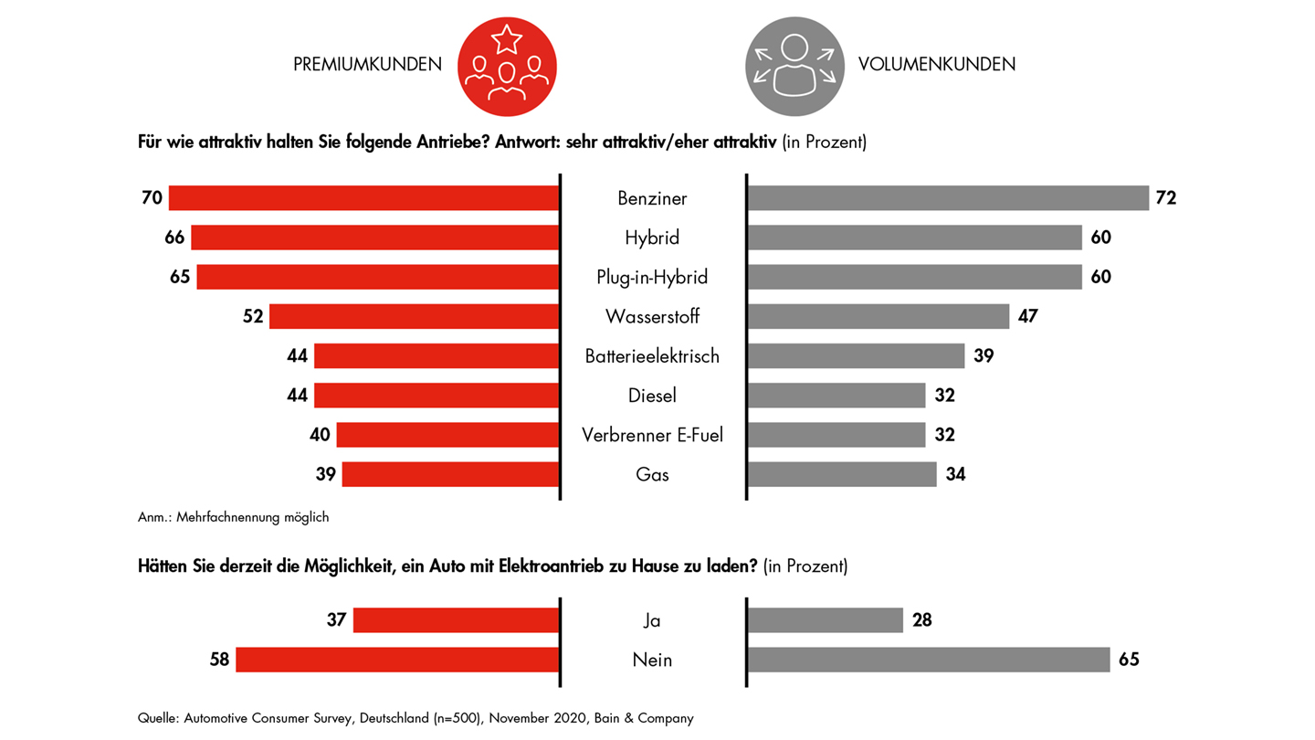 „Ein wesentlicher Grund dafür ist, dass bislang vergleichsweise wenig Privatkunden hierzulande die Chance haben, ihr Fahrzeug zu Hause zu laden“, erklärt Bain-Partner Karl Strempel. Im Premiumsegment verfügen 37 Prozent der Befragten über eine eigene Lademöglichkeit, im Volumensegment sind es 28 Prozent.