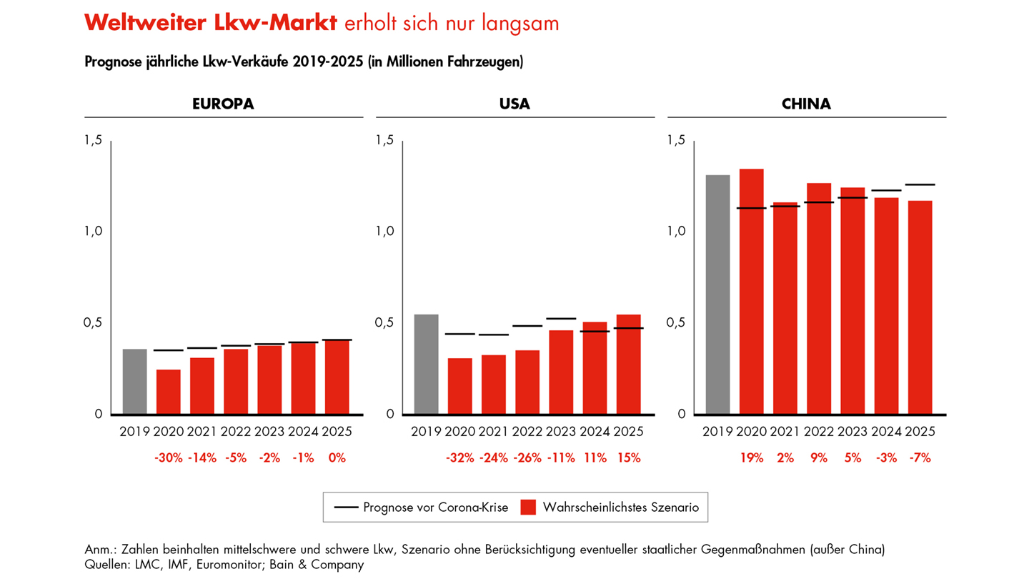 Der globale Lkw-Markt hat zwar schon vor der Corona-Krise geschwächelt. Doch der coronabedingte Lockdown im Frühjahr des Jahres lässt den weltweiten Lkw-Absatz 2020 nun noch einmal deutlich stärker einbrechen – um voraussichtlich minus 14 Prozent gegenüber der ursprünglichen Prognose. Dabei leidet der US-Markt mit einem Rückgang von 32 Prozent ähnlich stark unter der Krise wie Europa mit minus 30 Prozent. Anders in China: Nach Verlusten im Frühjahr wird der dortige Lkw-Markt 2020 voraussichtlich um 3 Prozent zulegen gemessen an 2019 und sogar um 19 Prozent gegenüber der ursprünglichen Prognose für 2020. Zurückzuführen ist dies auf massive staatliche Fördermaßnahmen insbesondere im Bausegment, die sich auch auf die Lkw-Nachfrage auswirken. Die Erholung in anderen wichtigen Weltregionen wird indes langsamer verlaufen. In Europa ist bis 2022 wieder mit einem spürbar wachsenden Bedarf zu rechnen. Dagegen dürfte in den USA die Zahl der verkauften Trucks erst um 2024 das Vorkrisenniveau übersteigen.