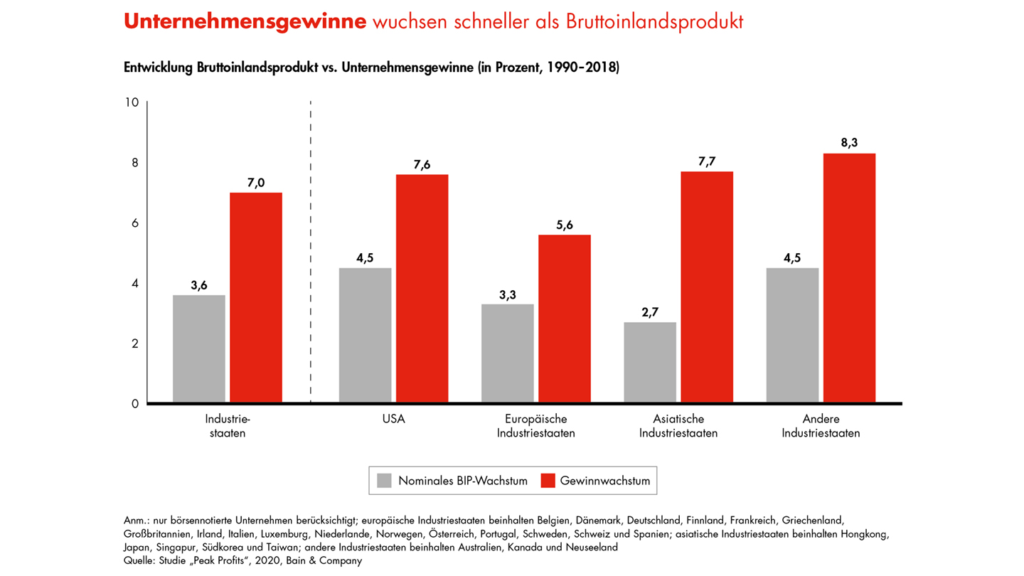 Seit 1990 kannten die Gewinne vieler Unternehmen weltweit nur eine Richtung: nach oben. Mit im Schnitt jährlich 7 Prozent sind sie bis 2018 fast doppelt so stark gewachsen wie das Bruttoinlandsprodukt vieler Industriestaaten. Doch diese goldene Ära könnte sich dem Ende zuneigen, wie die Bain-Studie „Peak Profits“ in Zusammenarbeit mit dem Marktforschungsinstitut Oxford Economics zeigt. Dafür wurde die Profitabilität von 13.000 börsennotierten Unternehmen in 26 Ländern analysiert. Bereits vor der Corona-Krise haben sich in der industrialisierten Welt sinkende Wachstumsraten angedeutet – der Profitgipfel schien erreicht. Und die globale Rezession infolge der Pandemie könnte diesen Trend noch einmal verstärken.