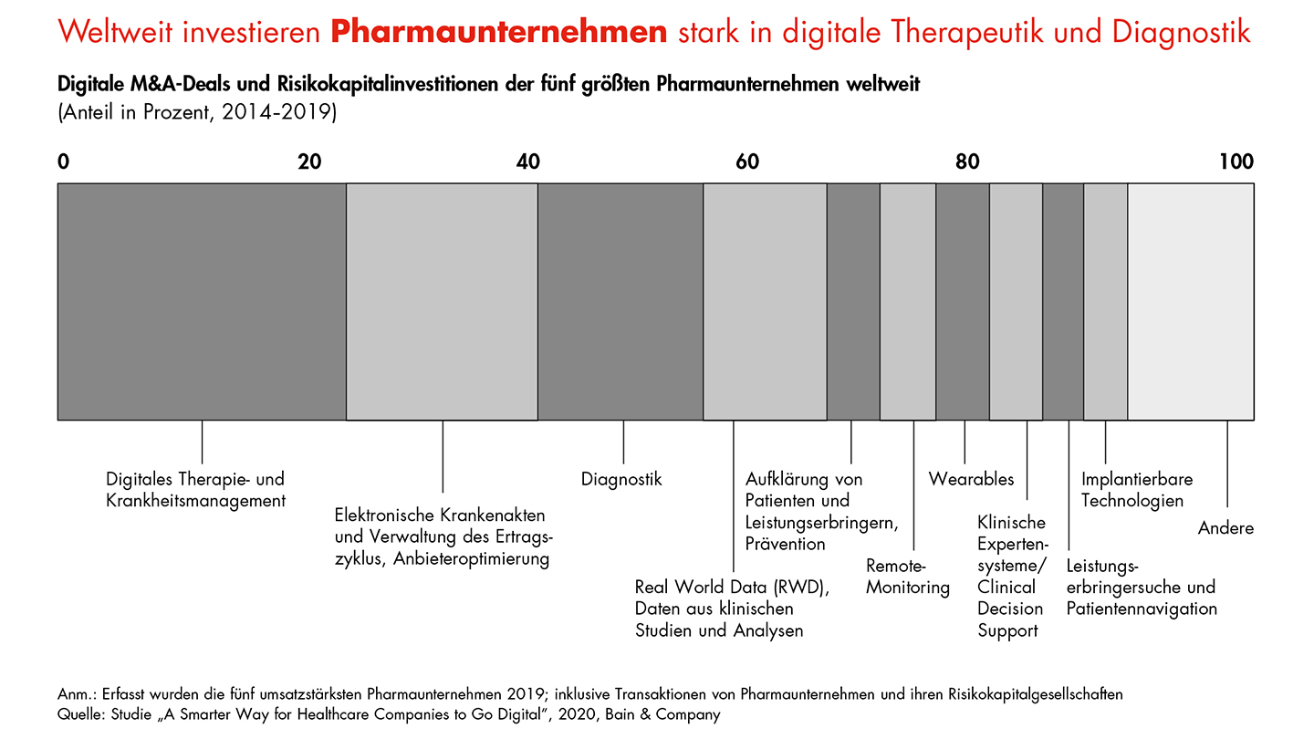 Die weltweit fünf umsatzstärksten Pharmaunternehmen investierten im Zeitraum 2014 bis 2019 massiv in digitale Gesundheitslösungen. Transaktionen und Investitionen im Bereich des digitalen Therapie- und Krankheitsmanagements machten dabei den größten Anteil aus. Insgesamt setzen bereits viele Unternehmen vermehrt auf digitale Technologien, um so ihr Kerngeschäftsmodell zu überarbeiten. Auch etablierte Digitalkonzerne wie Apple, Google, Amazon und Tencent investieren Millionen US-Dollar in neue Gesundheitsplattformen. Das zahlt sich offenkundig aus, wie unsere aktuelle Studie „A Smarter Way for Healthcare Companies to Go Digital“ zeigt: Im Jahr 2017 lag die Gewinnspanne von Datenanalysefirmen, die im Gesundheitsbereich tätig sind, bei durchschnittlich 21 Prozent. Und dieser Wert soll in den kommenden Jahren noch deutlich steigen.
