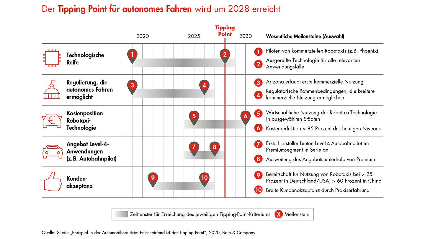 Für den langfristigen Erfolg des autonomen Fahrens sprechen die wachsende technologische Reife, aber auch Pilotprojekte mit Robotaxis und Autobahnpiloten auf Level-4-Niveau. Laut der Bain-Studie „Endspiel in der Automobilindustrie: Entscheidend ist der Tipping Point“ wird der Anteil autonomer Fahrzeuge an den Neuzulassungen bis 2030 in Nordamerika auf 9 Prozent steigen, in Europa auf 6 Prozent und im Raum Asien-Pazifik auf 4 Prozent. Zwischen 2030 bis 2040 können sich diese Werte mehr als vervierfachen. Bis der Massenmarkt erreicht ist, müssen die Anbieter allerdings noch einige Hürden überwinden. Dazu gehören die Allwettertauglichkeit und die Beherrschung von Situationen mit unübersichtlichem Verkehrsaufkommen. Zudem fehlen bislang weitgehend verbindliche rechtliche Rahmenbedingungen. Zudem müssen die Kosten für die autonomen Systeme erheblich reduziert werden. Diese belaufen sich für Robotaxis derzeit auf rund 65.000 Euro, könnten aber bis 2030 nach Bain-Analysen um mehr als 85 Prozent auf dann 8.000 bis 10.000 Euro fallen.