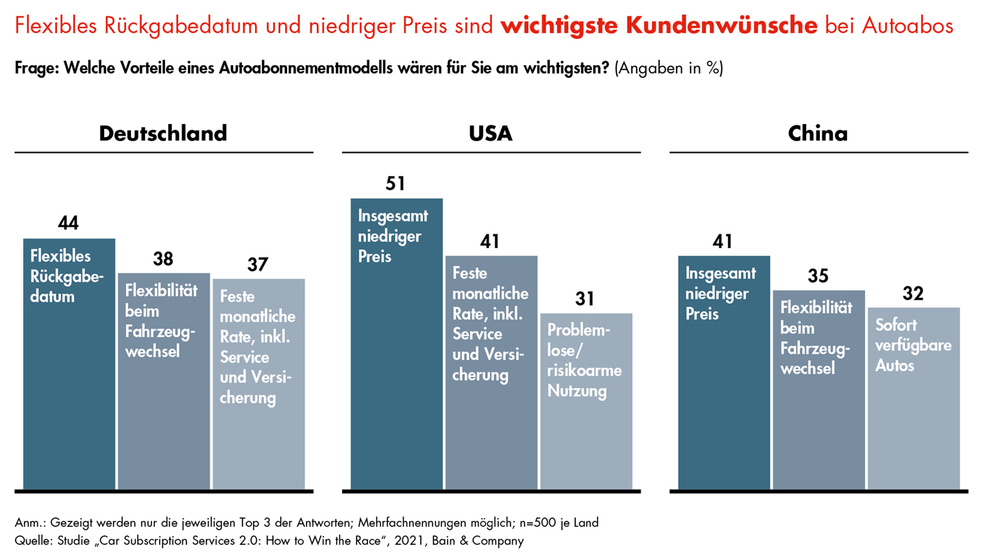 Immer mehr Kundinnen und Kunden interessieren sich für Autoabonnements. Mit überzeugenden Abomodellen stehen die Chancen für Automobilhersteller und Händler gut, ihren Marktanteil gegenüber Verleihern und Start-ups auszubauen und zu verteidigen. Dabei unterscheiden sich die Kundenwünsche je nach Land zum Teil deutlich. In den USA wird ebenso wie in China ein niedriger Preis als wichtigster Faktor bei Abonnements angegeben. Dagegen liegt der Fokus in Deutschland mit 44 Prozent der Nennungen auf einem variablen Rückgabezeitpunkt. Dies hat die internationale Unternehmensberatung Bain & Company in der Studie "Autoabonnements 2.0: So gewinnen Anbieter jetzt das Rennen" ermittelt, für die insgesamt 1.500 Personen in Deutschland, den USA und China befragt wurden.