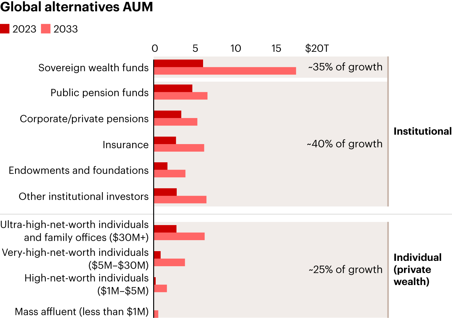 Sovereign wealth funds, meanwhile, are transforming private capital’s supply side. SWFs in aggregate already control investment capital worth $6 trillion, and Bain projects that total will grow 11% annually over the next decade to $17 trillion. State-based institutions ADIA in Abu Dhabi and GIC in Singapore have each grown their exposure to alternatives by more than 10% annually over the past decade and have seen their alternatives programs grow to over $360 billion and nearly $250 billion, respectively.