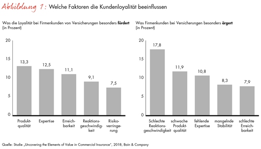 Wenig Kundenkontakt, viele Anbieter und die starke Stellung der Makler: Das sind Gründe, weshalb Versicherer den Wettbewerb um Firmenkunden derzeit vor allem über den Preis austragen, und andere Aspekte unterschätzen. Dies zeigt die aktuelle Studie „Uncovering the Elements of Value in Commercial Insurance“ der internationalen Managementberatung Bain & Company, für die mehr als 1.300 Versicherungskunden und Makler in den USA befragt wurden. Zwar erklären die meisten Kunden, dass Risikobegrenzung und Preis für sie die entscheidenden Gründe für die Auswahl eines Versicherers seien. Ihr Handeln spricht jedoch eine andere Sprache. Demnach sind auch Kriterien wie Produktqualität, Expertise und Erreichbarkeit von großer Bedeutung (Abb. 1).
