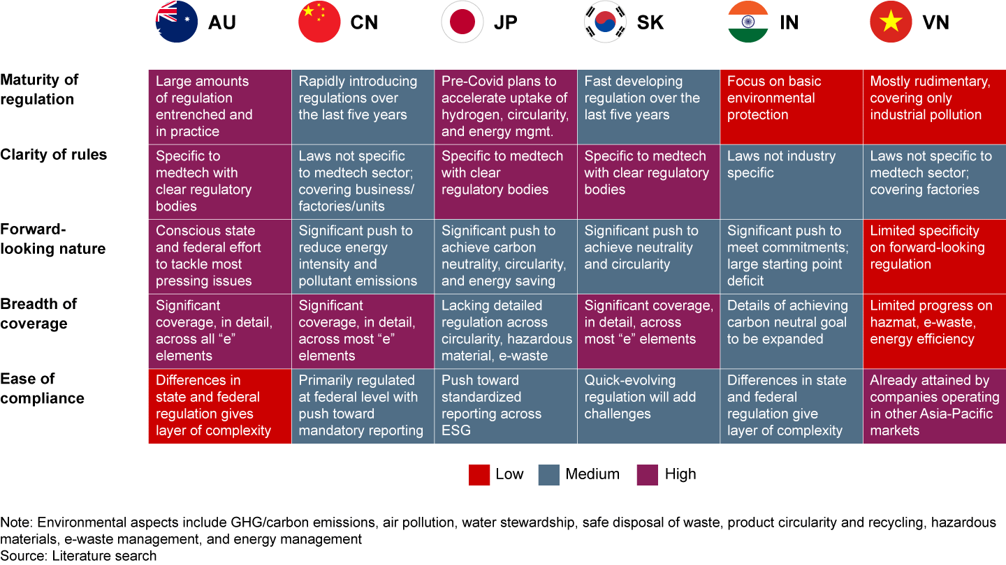 As medtech companies continue to develop the “environment” aspect of their ESG agendas, there are several challenges but also an ecosystem of support, opportunities, and incentives in a growing number of markets. The environmental policy landscape in the Asia-Pacific region displays varying degrees of maturity, which introduces a nuanced layer of complexity for medtech companies.
