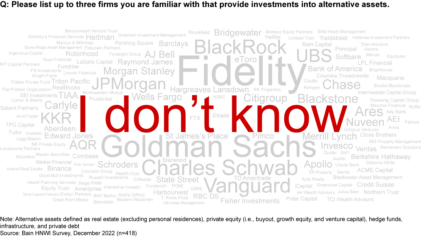 One reality any retail strategy has to face is that private equity and the broader alternatives industry lack both brand recognition and a clear understanding among many high-net-worth individuals of how the business model works. Ask a wealthy person who the big names in private equity are and “I don’t know” rises to the top, followed by large financial institutions such as Fidelity and Charles Schwab that barely have any presence in alternatives (see Figure 6).