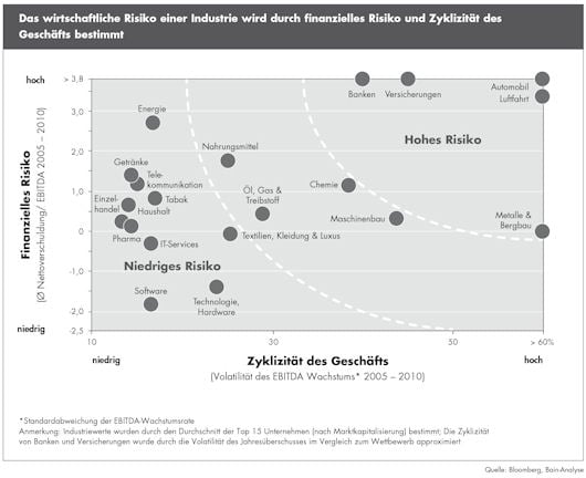Die Einschätzung des vertretbaren Risikos hängt unter anderem von der Krisenanfälligkeit des Geschäfts ab. Neben den Banken und Versicherungen, deren Risiken im Geschäftsmodell die globale Finanzkrise offenbarte, sind die Automobil- und Luftfahrtbranche einem besonders hohen wirtschaftlichen Risiko ausgesetzt. Aber auch der Maschinenbau sowie die Chemieindustrie tragen überdurchschnittlich hohe wirtschaftliche Risiken. Ein traditionell hoher Verschuldungsgrad sowie die hohe Zyklizität der Nachfrage in den zugrunde liegenden Geschäften treibt das Risikoprofil. Andere Industrien sind dagegen weit weniger riskant aufgestellt: Hierzu zählt der Technologiesektor, aber auch die Pharma- und Konsumgüterbranche. Eine vergleichsweise hohe Profitabilität, eine geringe Zyklizität des Geschäfts sowie eine solide Finanzierung sorgen hier für Stabilität.