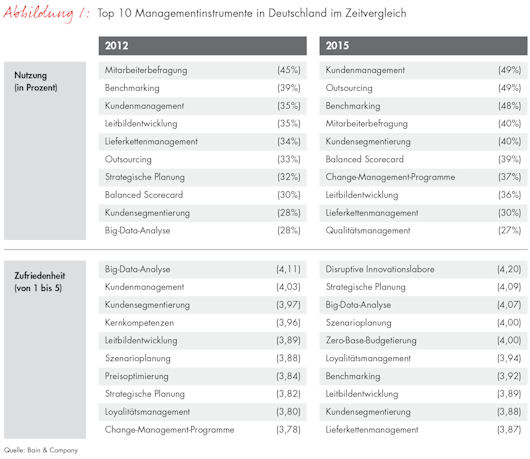 Zum 14. Mal veröffentlicht Bain & Company die weltweit umfangreichste Analyse der international dominierenden Managementinstrumente. Seit Erscheinen der ersten Studie „Management Tools & Trends“ im Jahr 1993 hat Bain mehr als 13.000 Führungskräfte befragt. Allein für die diesjährige Ausgabe standen über 1.000 Top-Manager aus Unternehmen aller Größen in Europa, Nordamerika, Lateinamerika und Asien Rede und Antwort.