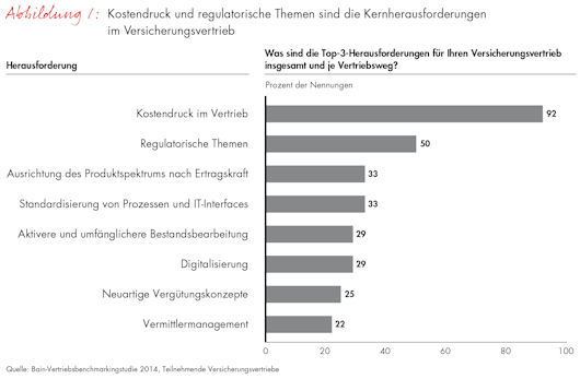 Handlungsbedarf und Kostendruck sind immens. Das ist den Versicherungsunternehmen durchaus bewusst. So ist dem Bain-Benchmarking zufolge der Kostendruck im Vertrieb die wichtigste Herausforderung für Vorstände. Platz zwei belegen regulatorische Themen, gefolgt von der Ausrichtung des Produktspektrums nach seiner Ertragskraft (Abb. 1). Die Versicherungsunternehmen wissen also um die Dringlichkeit dieser Aufgaben. „Konzentrieren sich die Versicherer allein auf Kostensenkungen, droht ihnen eine Abwärtsspirale aus sinkenden Erträgen und zusätzlich nötigen Einsparungen“, warnt Dr. Christian Kinder, Partner bei Bain & Company und Autor der Studie. „Ein schleichendes Aus wäre für viele die Folge.“