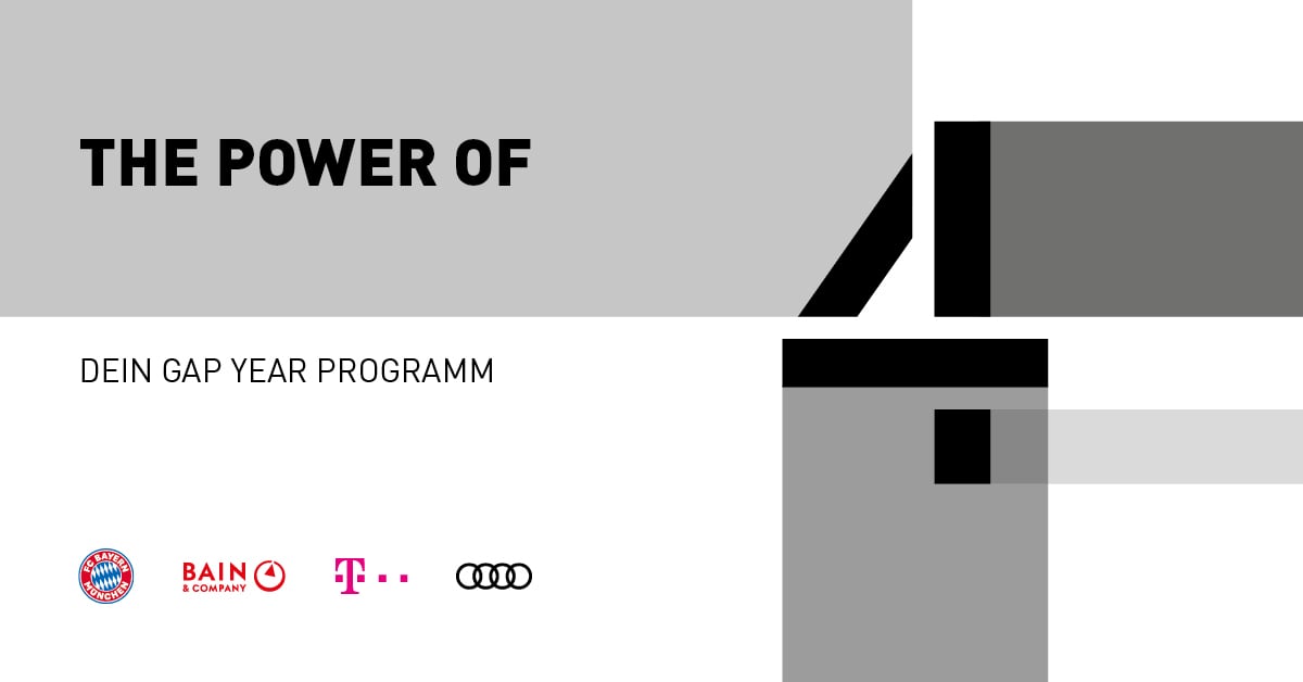 Mit dem Bachelorabschluss in der Tasche die Zeit vor dem Masterstudium für die persönliche und fachliche Weiterentwicklung nutzen: Audi, Bain & Company, Deutsche Telekom und der FC Bayern München starten gemeinsam ein exklusives Gap-Year-Programm für herausragende Bachelorabsolventen aller Fachrichtungen. Ein Jahr lang erhalten die Teilnehmer durch Praktika tiefe Einblicke in die vier Partnerunternehmen und lernen dabei die unterschiedlichen Branchen kennen. Zu den Vorzügen des Programms zählen zudem ein individuelles Mentoring, zahlreiche Veranstaltungen und Trainings. Darüber hinaus bietet es ausreichend Gelegenheit zum Netzwerken.