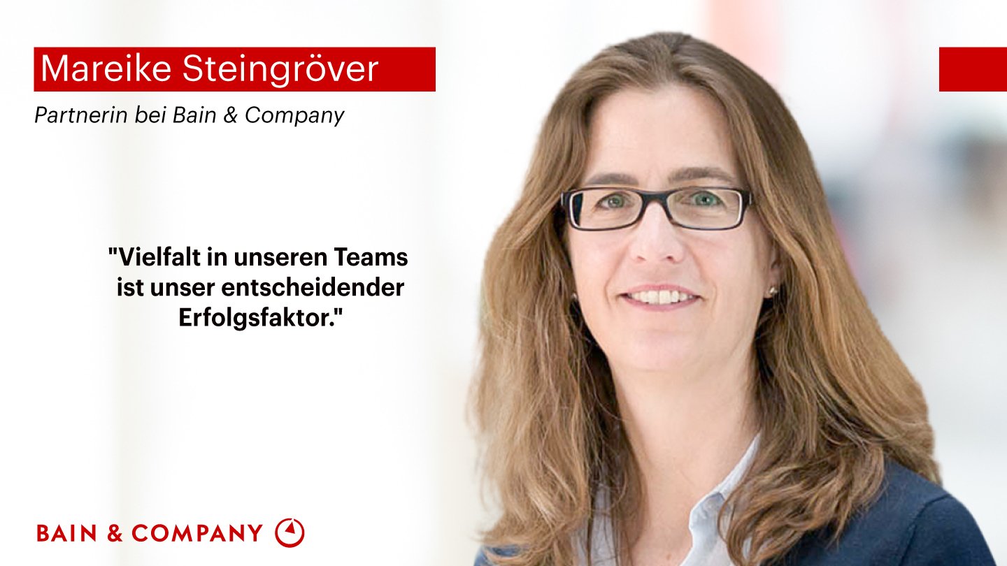 „In den vergangenen Jahren konnten wir den Anteil der Beraterinnen bei Bain kontinuierlich steigern“, erklärt Bain-Partner Nikolaus Zacher, zuständig für das Recruiting im deutschsprachigen Raum. „Bei der Gestaltung der individuellen Karrierewege legen wir sehr viel Wert darauf, dass die Frauen bei Bain nicht nur ihre beruflichen, sondern auch persönliche Ziele verwirklichen können.“ Flexible Arbeitszeitmodelle, passgenaue Trainings und Initiativen wie das internationale Netzwerk Women@Bain oder das Non-Business-Hire-Netzwerk von Bain unterstützen sie dabei.