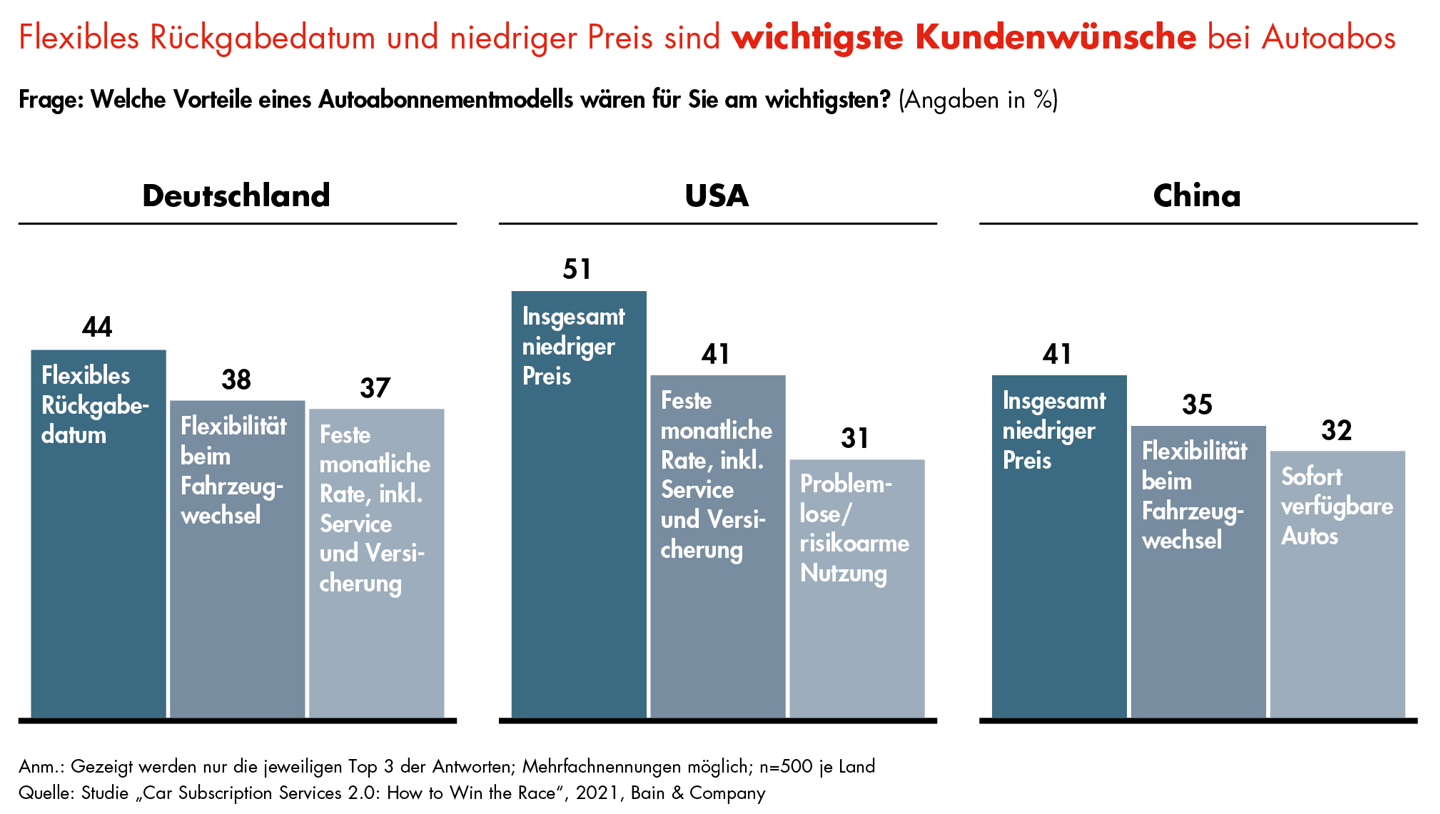 - Die Kundenvorstellungen sind weltweit gleich. In den USA wird ebenso wie in China ein niedriger Preis als wichtigster Faktor bei Abonnements angegeben. Dagegen liegt der Fokus in Deutschland mit 44 Prozent der Nennungen auf einem variablen Rückgabezeitpunkt (Abbildung).