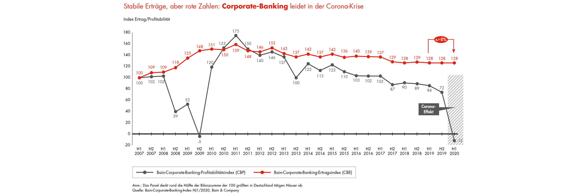 Der halbjährlich erhobene Bain-Corporate-Banking-Index basiert auf veröffentlichten Daten führender deutscher Banken. Das Panel deckt rund die Hälfte der Bilanzsumme der 100 größten in Deutschland tätigen Banken ab und konzentriert sich auf Finanzinstitute mit einem Schwerpunkt im Corporate-Banking und einer entsprechenden Segmentberichterstattung. Bei der erstmaligen Erstellung erfasste Bain für die Jahre 2007 bis 2012 zahlreiche Rohdaten jeder einzelnen Bank, darunter die Erträge (Zins- und Provisionsüberschuss), die Kostenstruktur (Verwaltungsaufwand), die Kreditrisikovorsorge, die Profitabilität (Ergebnis vor Steuern), das Eigenkapital und das Kreditvolumen. Die Wahl des Ausgangsjahrs 2007 ermöglicht Vergleiche zwischen dem letzten Jahr vor Ausbruch der globalen Finanzkrise und der aktuellen Situation.
