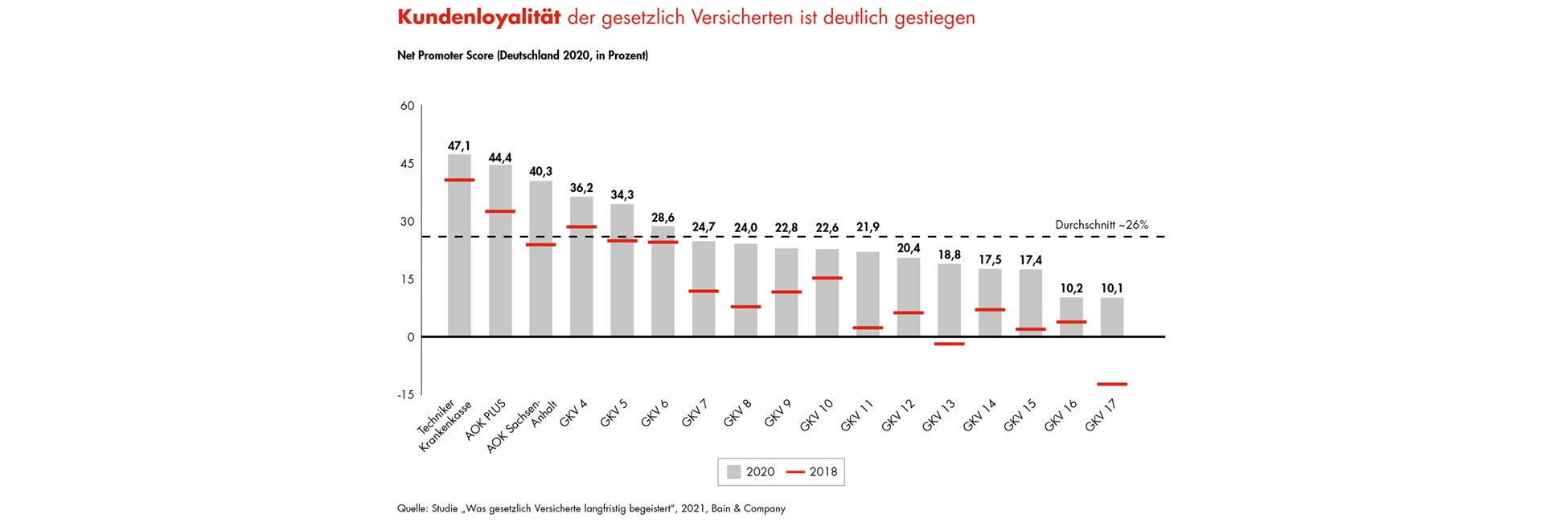„Die Kunden honorieren die Zuverlässigkeit ihrer Krankenkasse in ausgesprochen schwierigen Zeiten“, erklärt Andreas Becker, Bain-Partner und Co-Autor der Studie. Die Versicherungen seien während der Corona-Pandemie meist rund um die Uhr erreichbar, die persönliche Beratung über digitale Kanäle habe sich etabliert. Hinzu käme ein weiterer Erfolgsfaktor. „Die gesetzlichen Krankenversicherungen arbeiten seit Jahren daran, die Erwartungen ihrer Kunden besser zu erfüllen“, so Becker. „Diese Anstrengungen beginnen sich auszuzahlen.“