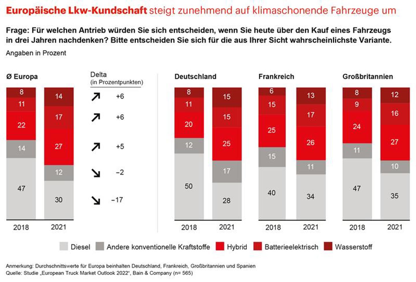 Auf ihrem Erfolg ausruhen dürfen sie sich jedoch nicht. Alternative Antriebsformen rücken zunehmend in den Fokus von Flottenbesitzern und -betreibern. So denken nur noch 30 Prozent der Befragten darüber nach, in drei Jahren einen Lkw mit klassischem Dieselmotor anzuschaffen. In Deutschland sind es 28 Prozent – nach 50 Prozent im Jahr 2018. „Der Diesel wird allmählich zum Auslaufmodell, da sein CO2-Ausstoß die Klimabilanz der Kundschaft belastet“, erklärt Dr. Jörg Gnamm, Bain-Partner und Co-Autor der Studie. „Damit endet für Lkw-Hersteller auch die Pilotphase für neue Antriebskonzepte.“ Wer in puncto E- und Wasserstofffahrzeugen nicht bald über eine umfassende Modellpalette verfüge, müsse sich darauf einstellen, Marktanteile zu verlieren.