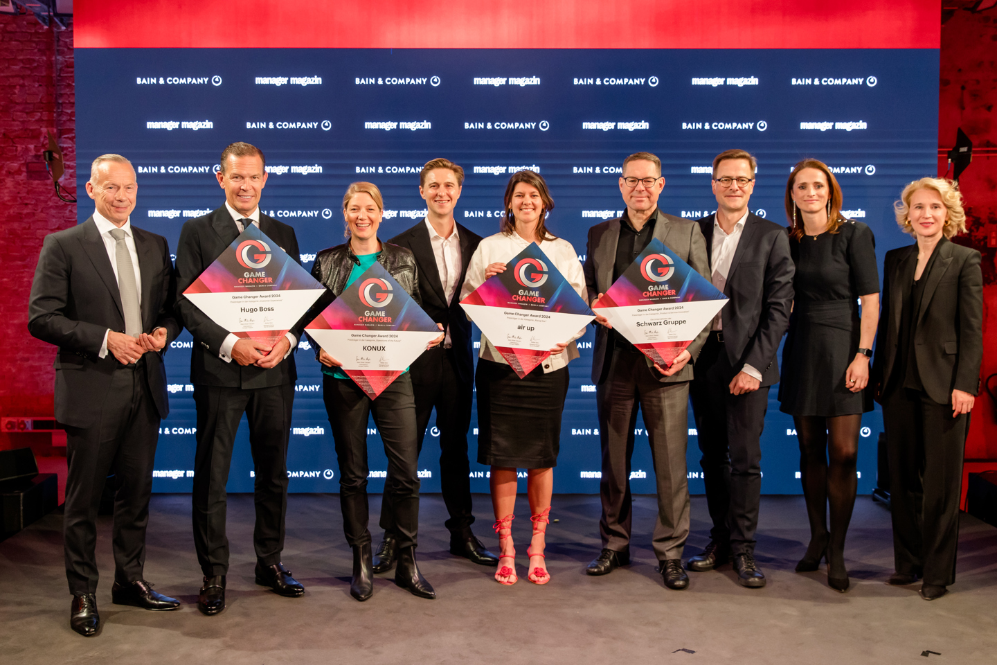 Hugo Boss AG, die Unternehmen der Schwarz Gruppe, KONUX GmbH und air up GmbH sind die Preisträger des „Game Changer Award“ 2024. Den renommierten Wirtschaftspreis haben die internationale Unternehmensberatung Bain & Company und das manager magazin zum neunten Mal verliehen. Die Galaveranstaltung mit mehr als 200 geladenen Gästen fand am Donnerstagabend im DEEP in Berlin statt.