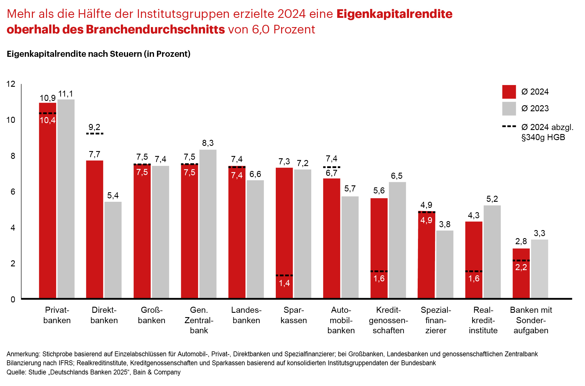 Für die elfte Auflage der Studie hat Bain & Company die Bilanz- und GuV-Strukturen der deutschen Kreditinstitute ausgewertet, von denen es 2024 noch rund 1.280 gab. Grundlage bilden Zeitreihen der Deutschen Bundesbank, der Europäischen Zentralbank (EZB) sowie Datenbanken von Dun & Bradstreet und S&P Global.