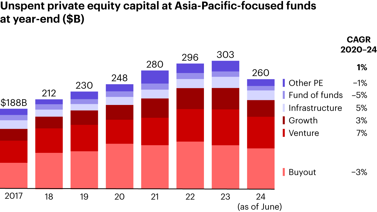 The fund-raising environment remained gloomy in 2024, and dry powder declined from a record level in 2023, reflecting challenging fund-raising conditions. Fund-raising at Asia-Pacific-focused funds fell 22% to a 10-year low (excluding RMB funds), mirroring the 23% decline in global fund-raising. Fund managers cited the challenge of too many groups competing for a shrinking pool of funds. As LPs gravitated to funds with a strong track record, large funds continued to get larger. CVC Capital Partners and TPG closed their biggest-ever Asia-Pacific-focused funds in 2024.
