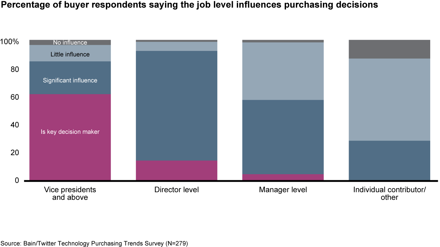 When it comes to product information, the survey found that buyers trust community sources over ads and other sources, such as sales reps, webinars and vendor websites (see Figure 1). Their preferences for community sources exceed marketers’ sense of the community’s importance across all dimensions (see Figure 2). The gap is most pronounced for recommendations from more junior colleagues because marketers have given short shrift to the influence of junior team members on the buying process. More than 50% of buyers said that manager-level colleagues have significant influence on technology purchasing decisions, with that number growing to as high as 80% for director-level staff below the title of vice president (see Figure 3).