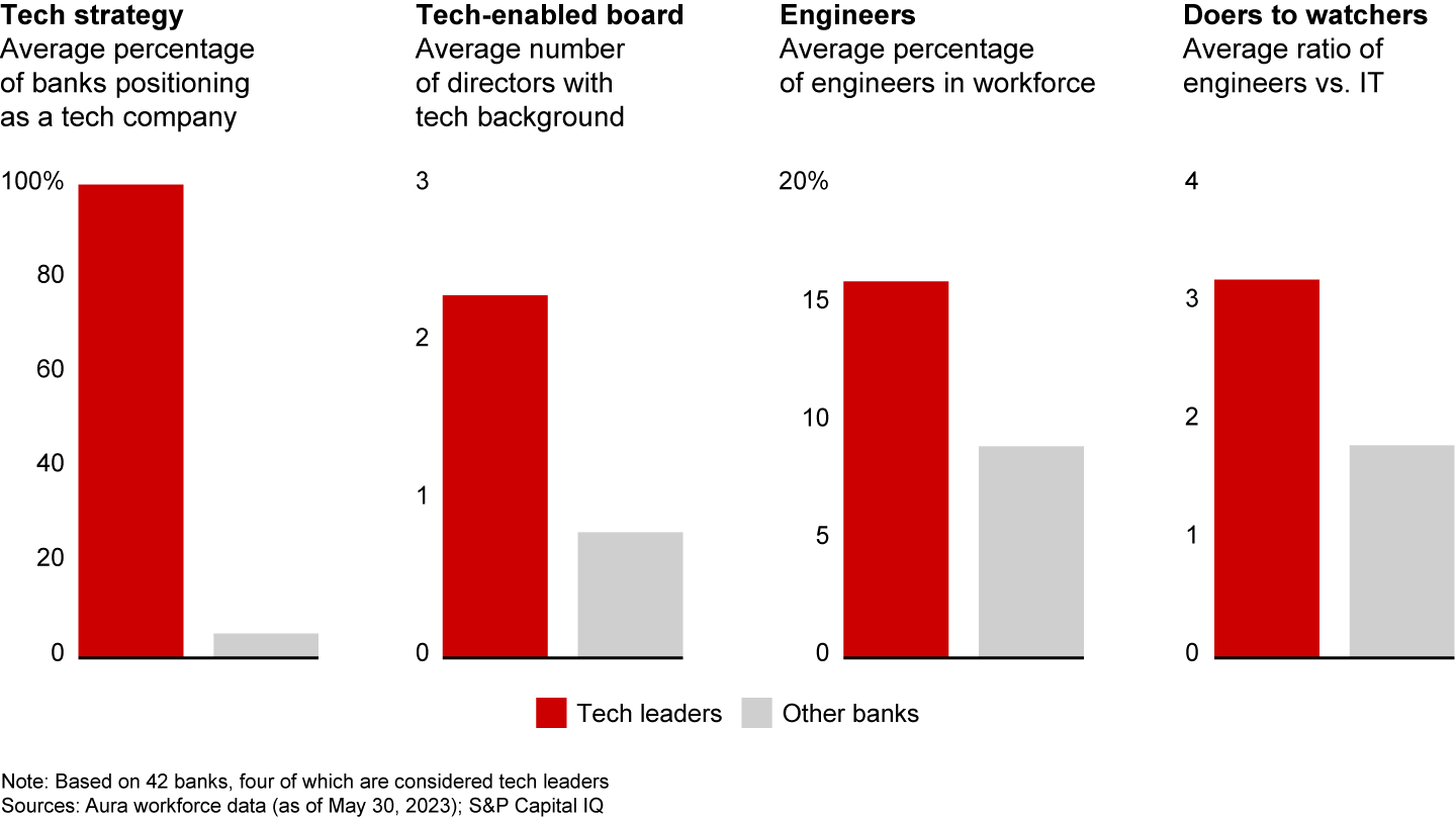 Tech leaders have bigger tech functions and more engineers on their IT staff (banking example)