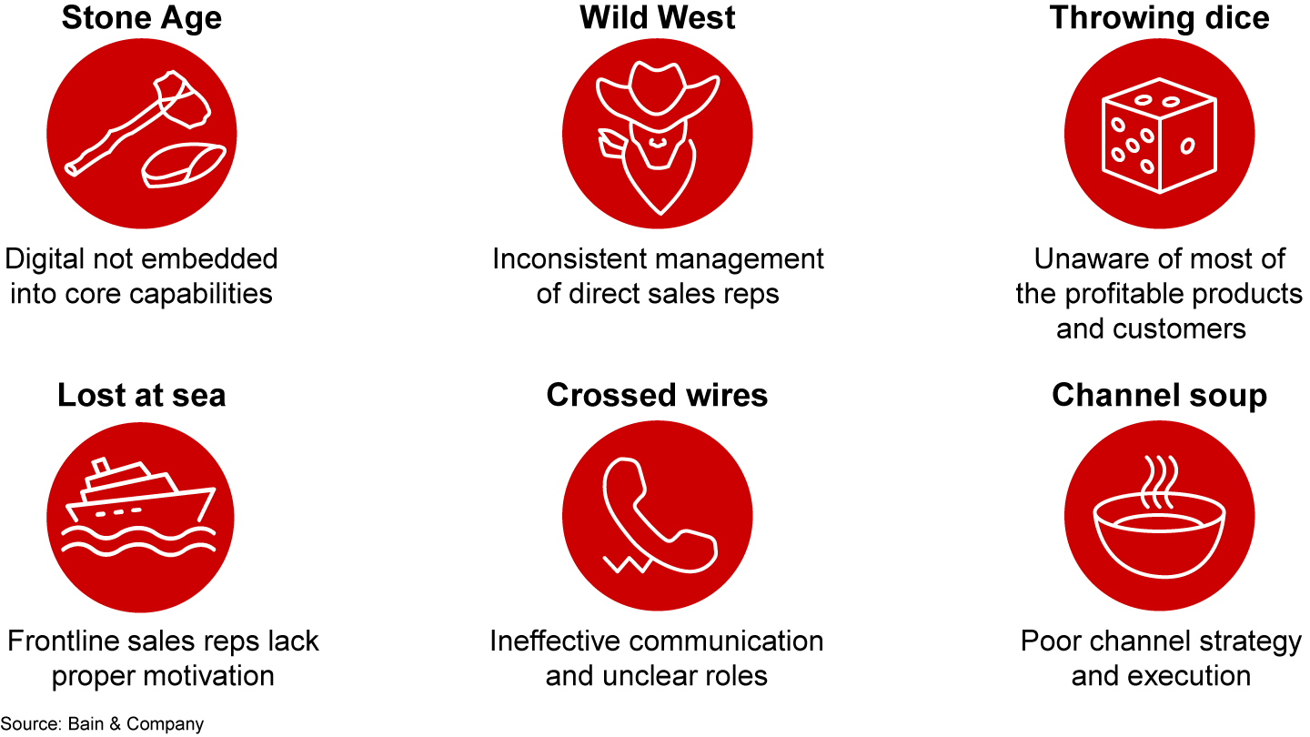 Stone Age—failing to embed digital tools and skills. This pattern sometimes surfaces among companies that previously operated in a simpler market, such as a concentrated customer set or slow pace of change, where it could manage the salesforce on a spreadsheet. In other cases, companies may have grown too fast to have taken the time to invest in the proper digital infrastructure.