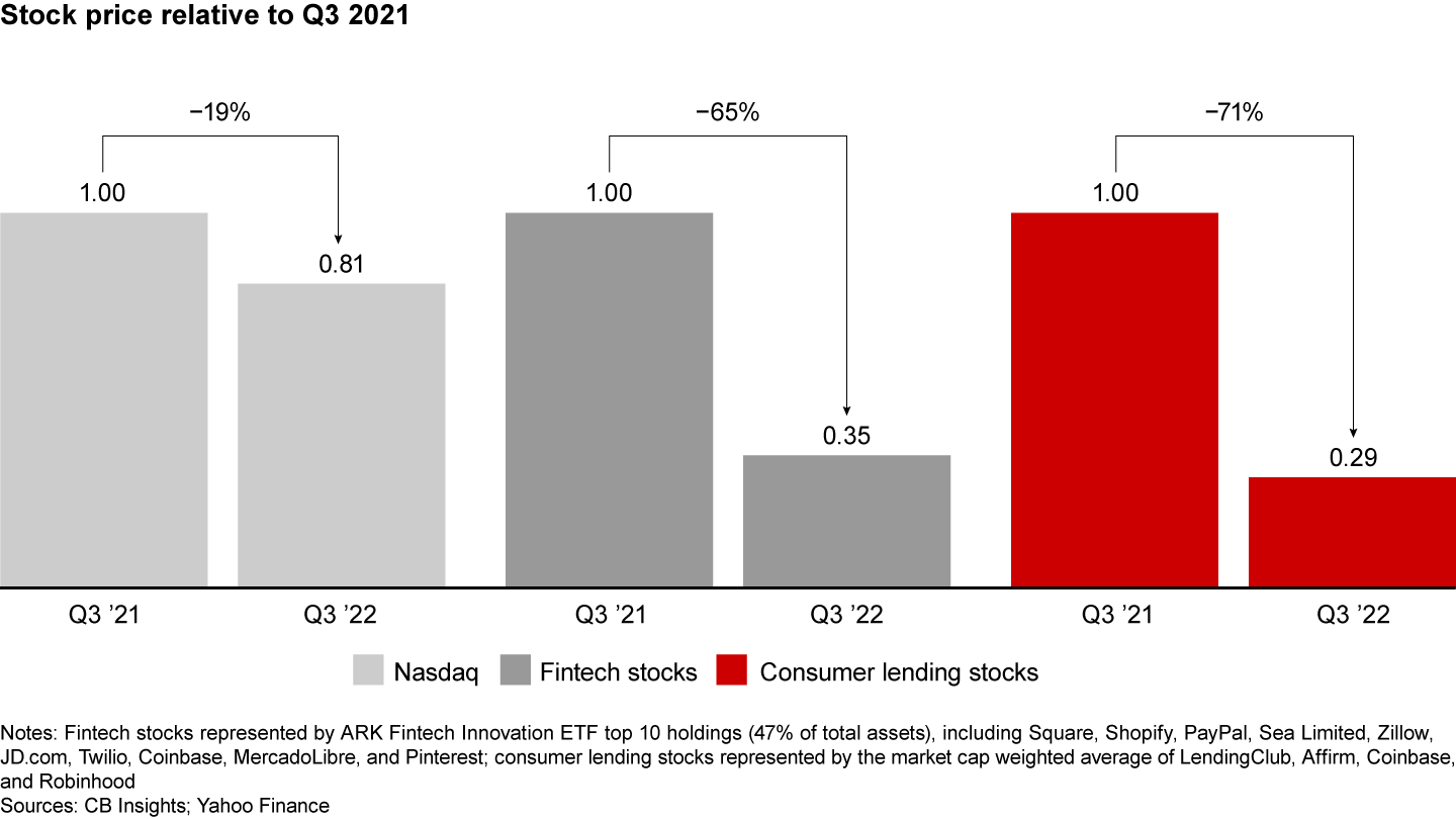 Fintechs have suffered with sharply reduced valuations and staff layoffs. In private markets, funding dropped by 33% between Q1 and Q2 of 2022, and in public markets, fintech companies fared worse than the broader tech sector. Fintech stocks declined 65% in Q3 2022 vs. the prior year, compared to 19% for the Nasdaq (see Figure 1). And a specific group of fintechs has been especially hard hit: consumer-focused businesses, especially those focused on lending, such as “buy now, pay later” firms.