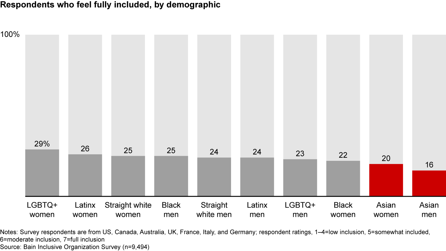 Asian men and women feel the least included of all the demographic groups Bain surveyed