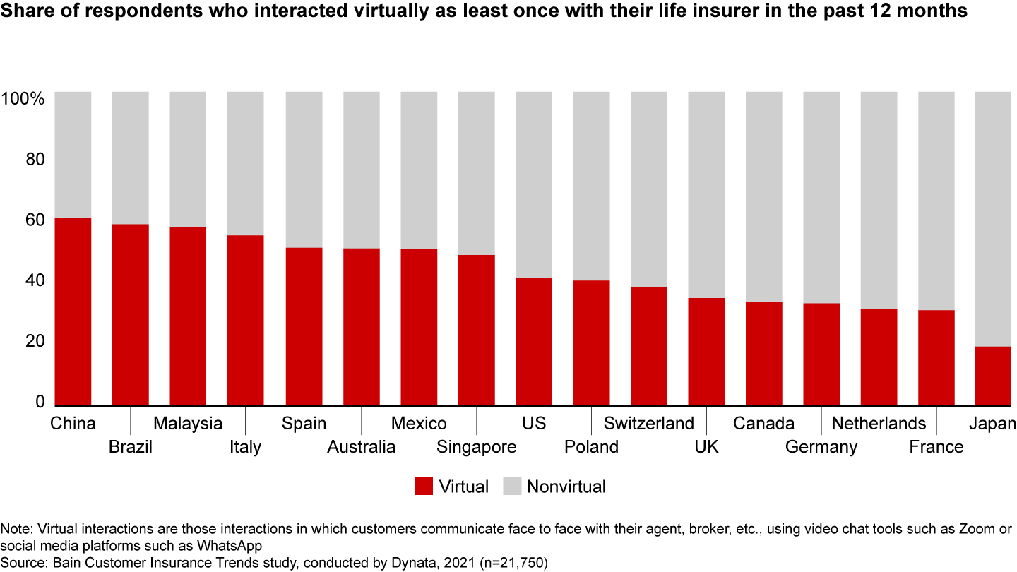 The Covid-19 pandemic and subsequent shutdowns forced many people to adopt digital means of communicating and interacting with their insurance agents. Over the past year, about 40% of consumers globally surveyed by Bain used a virtual channel, such as Zoom video software, at least once to interact with agents through such channel (see Figure 1).