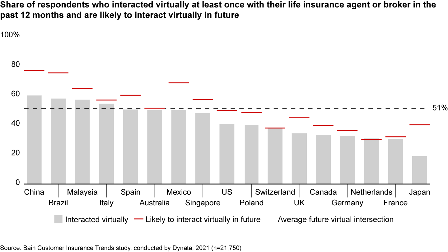- How quickly and how far should we move? Individual markets vary greatly in their digital readiness. Consumers in many Asian countries routinely use mobile digital channels for all kinds of commerce, including insurance. Generally speaking, Asian insurers recognize the need to go very far, very quickly. In Thailand and Singapore, a separate Bain survey found that consumers want more high-quality advice from insurance agents, so insurers will need to figure out how to improve remote advice.