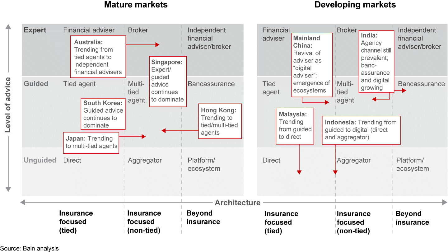 • The insurance distribution landscape is changing. In life insurance, traditional channels remain dominant in mature markets such as Australia, Hong Kong, Singapore and Japan, but in developing markets such as mainland China, India, Malaysia and Indonesia, digital channels are becoming more prominent.