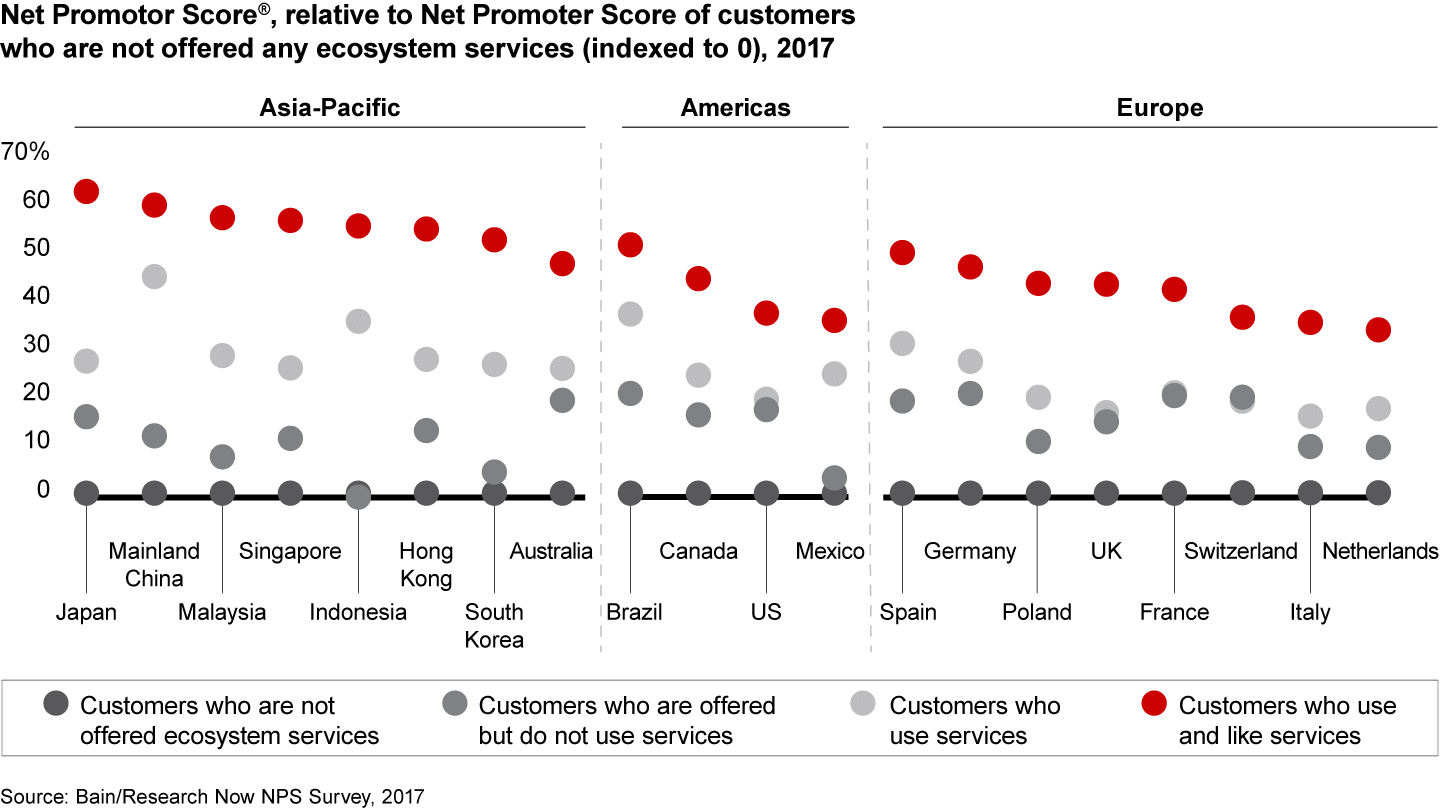 - By the widest margins among the three major regions of the world, Asia-Pacific customers who use and like ecosystem services give their insurers the highest loyalty ratings.