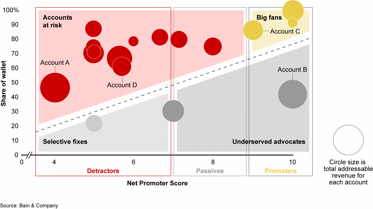 One logistics company had an e-commerce customer with a low share of wallet and relatively low Net Promoter Scores. The company had underestimated the overall size of the account, as the account was part of a larger portfolio owned by a parent company. This insight led the logistics firm to intervene with this e-commerce account and gain a higher share of the business over time, as the customer shifted from dual-sourced to single-sourced. - Big fans. Sales leaders know this short list—the strongest advocates who buy more and frequently bring in referrals. High-performing companies actively rally their promoters to earn growth, by using them as a reference when selling to a new customer, having them provide testimonials, or featuring them in their annual conferences.