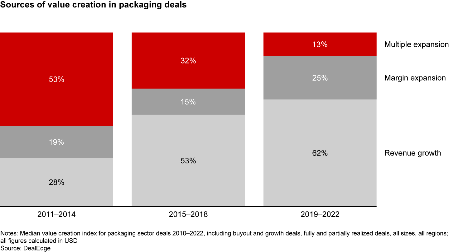 The flurry of M&A activity has been enabled by important end markets such as packaged food, home care, and pharma, which have been resilient in down cycles and have even shown consistent positive growth rates through the global financial crisis of 2008–2009 and 2020’s Covid-19 pandemic-related crash. This resilience has in turn spurred more M&A activity and private equity interest. While end-market resilience will remain a key attraction to invest in packaging going forward, it also requires investors to become much more activist to create value through margin expansion and revenue growth (as multiple expansion is no longer a given).