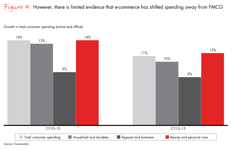 - The rise of e-tailing—there is no evidence for spending shifting away from FMCGs.