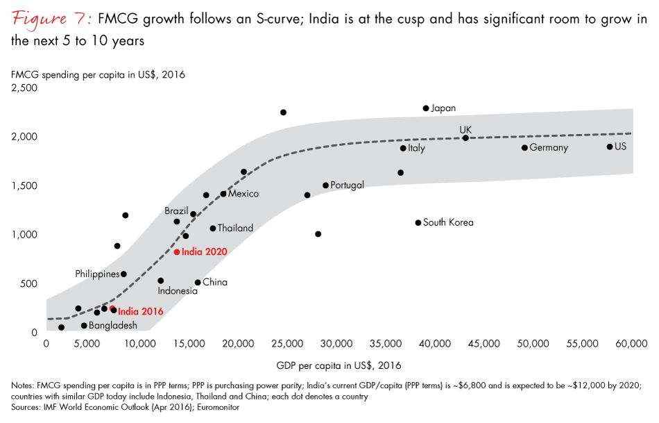 - India is at the cusp of the FMCG S-curve, and the growth potential is huge.