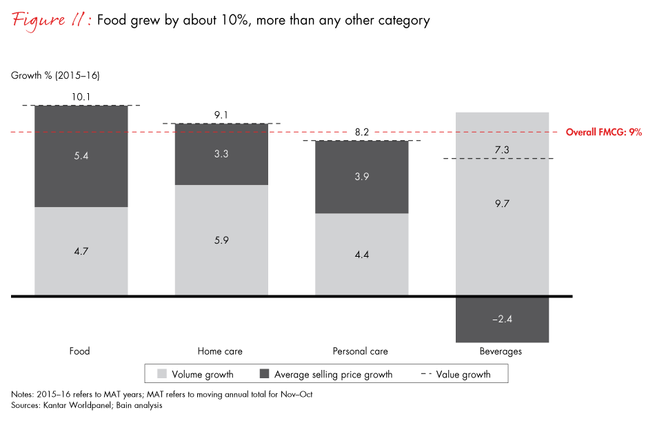 - Overall FMCG growth: 9.3% (MAT 15/16); food led growth at about 10% followed by home care at 9%.