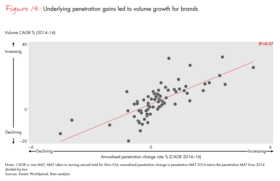 Trends in any industry are an aggregate of how brands in each category perform. With this framing, we dug deeper and looked at performance brand by brand to identify winning brands. Our analysis showed that one in seven brands was a winner from 2014 to 2016. These winning brands exist in many categories—from fragmented to consolidated, local to foreign dominated and high to low growth. What unites them is their singular focus on increasing penetration—concentrating on this much more than on other metrics, such as purchase frequency or repurchase rate. In addition, some smaller brands are snapping at the heels of current leaders, aggressively growing volume through penetration gains.