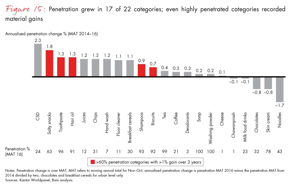 - Even highly penetrated categories such as toothpaste, hair oil, salty snacks, shampoos and biscuits increased penetration.