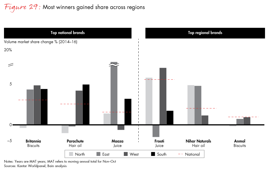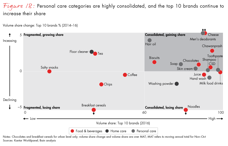 Building these assets is not a one-time activity. It requires continuous investment, especially as the industry becomes more competitive. While market leaders in 19 out of 22 categories maintained their leadership positions from 2014 to 2016, about 50% lost share. Further, only one in seven brands were winners in 2016, down from one in five in 2015, signifying increased competitive intensity.