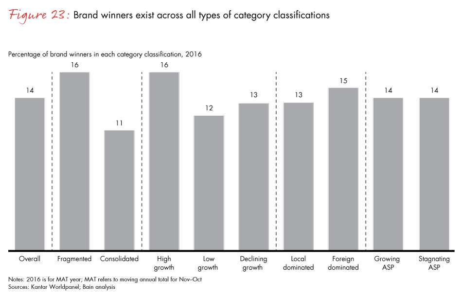 - One in seven brands are winning, down from one in five in 2015—as it becomes increasingly difficult to gain share.