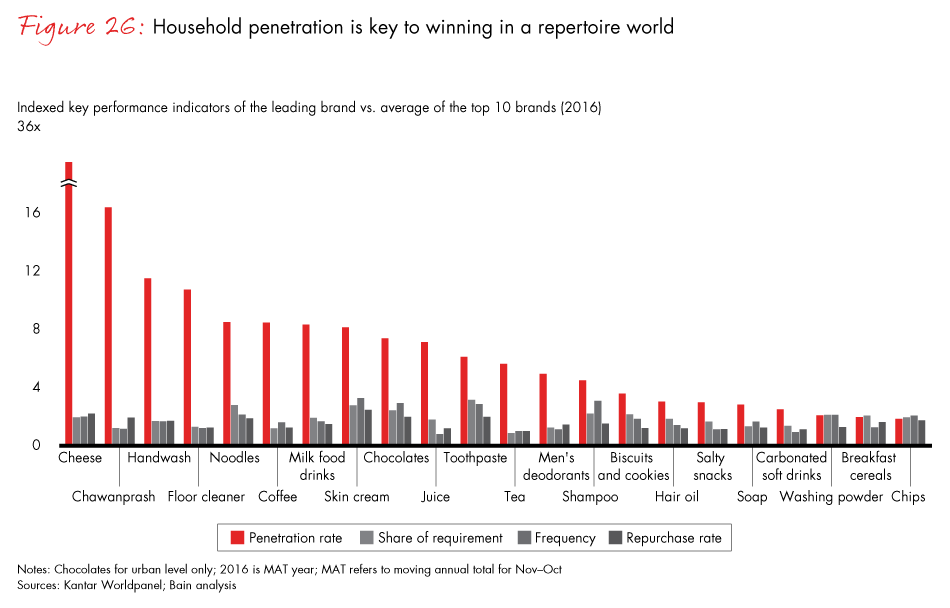 Consistent with our 2015 study, the 2016 brand winners also experienced high consumer churn, but managed to win by constantly driving recruitment and gaining from other brands. This increase in penetration also spurs more frequent purchases, increasing the likelihood of a brand becoming part of a consumer’s repertoire (consumer repertoire refers to the set of brands purchased by a shopper within a given category). These findings are in line with similar studies that we have undertaken across the globe in both developing markets, such as China and Indonesia, and developed markets, such as the US and the UK.