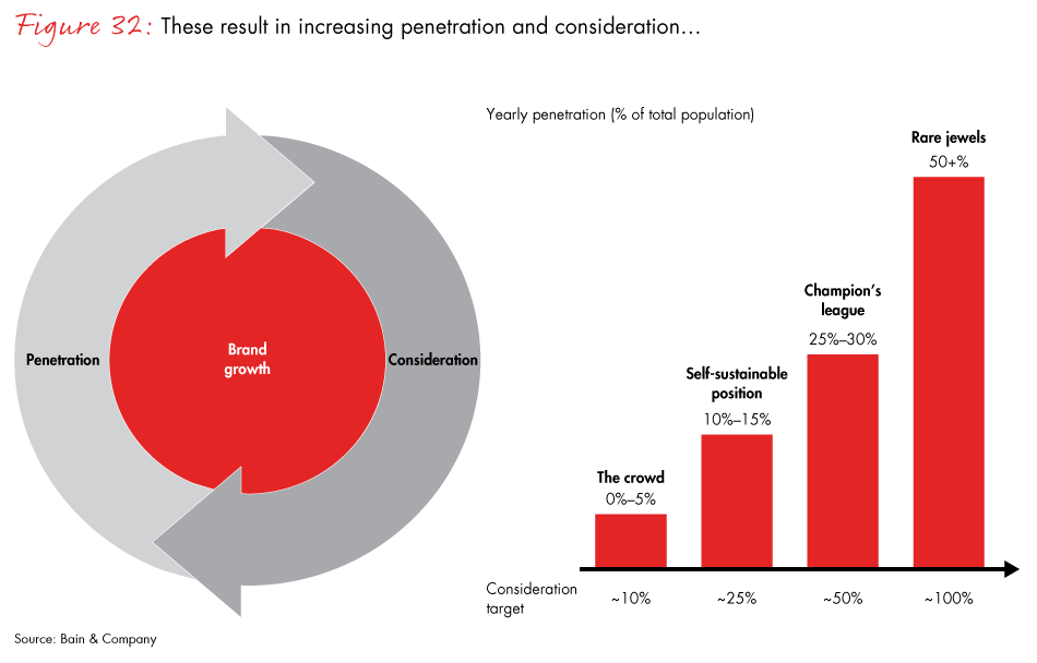 This report also underscores the research of the Ehrenberg-Bass Institute for Marketing Science, summarised by Professor Byron Sharp, director of the Institute, in his book How Brands Grow, based on decades of observations of buying behaviour. And our work with clients on growth strategies has shown that the best companies increase penetration and outperform their competitors by thoughtfully investing in both the quantity and quality of three key areas: