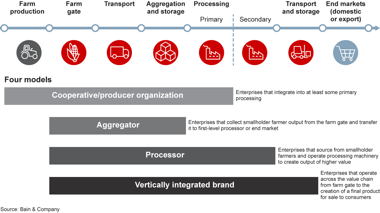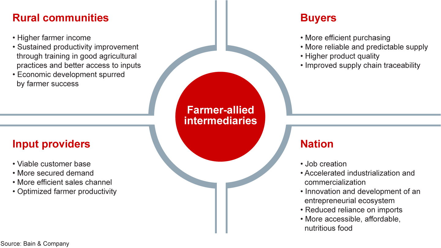 Working hand in hand with smallholder farmers, farmer-allied intermediaries, including producer organizations, aggregators, processors and vertically integrated food brands, can simultaneously achieve a number of critically important outcomes for a broad set of stakeholders. These include enhancing the livelihood of smallholder farmers and alleviating rural poverty, delivering quality agricultural output to buyers, creating a more efficient sales channel for input providers, making more nutritious food available to Africa’s growing populations, and creating jobs and contributing to broader economic development (see Figure 3).