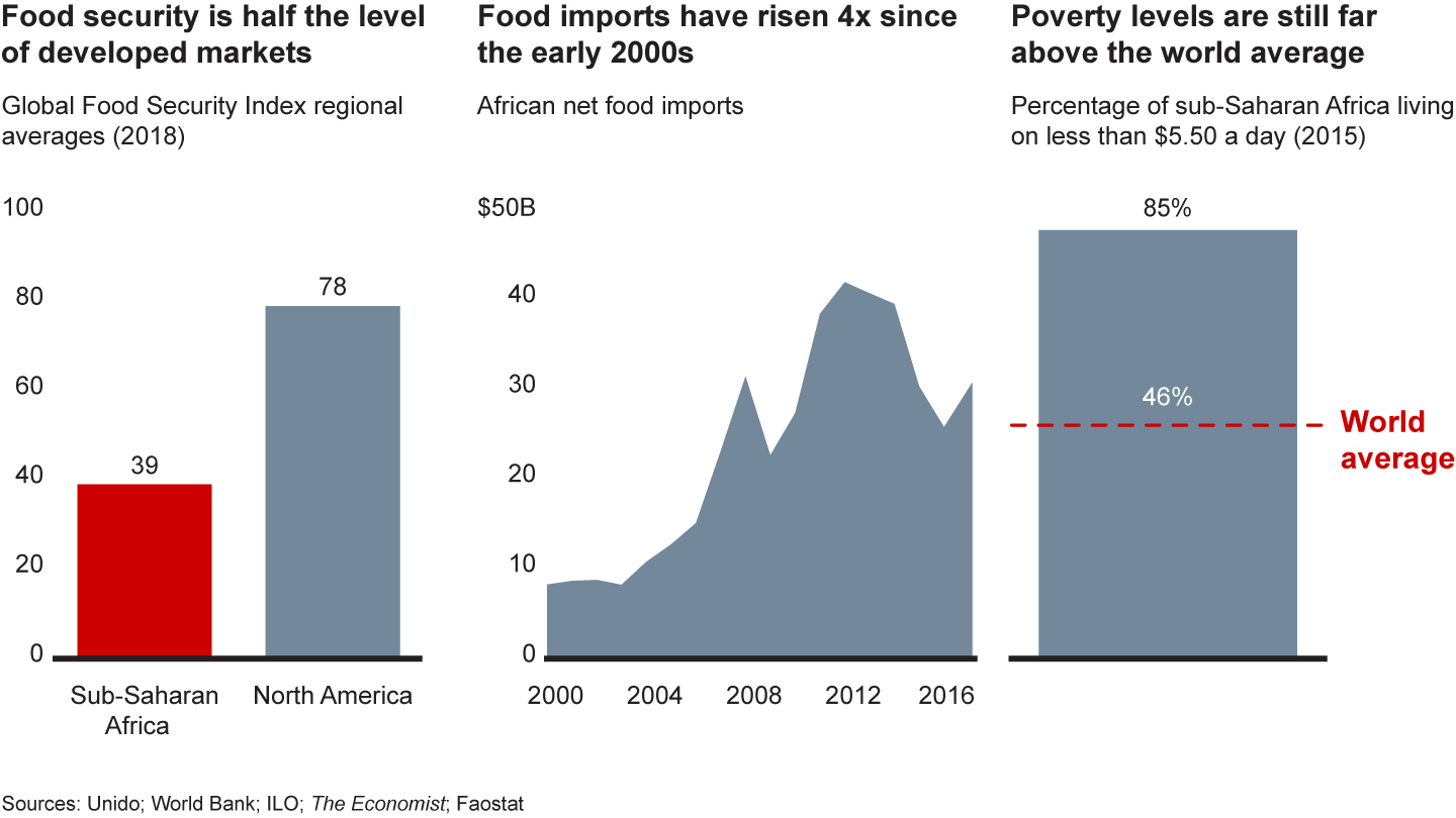 A new approach is needed. Business as usual simply cannot address the magnitude of the region’s current challenges. Over the past two decades, donor countries, multilaterals and foundations have directed almost $40 billion to African agriculture, according to our analysis of data from the UN’s Food and Agriculture Organization as well as the Organisation for Economic Co-operation and Development. Yet food security in the region remains about half that of developed markets. Net food imports have risen 400% since the early 2000s and, barring intervention, are projected to soar to more than $110 billion by 2025. While agriculture is the largest segment of the economy in many sub-Saharan African countries, frequently accounting for between 30% and 70% of employment and comprising approximately one-quarter of the region’s overall GDP, the portion of economic value captured beyond the farm gate is half the global average. And poverty levels, measured by the percentage of the population living on less than $5.50 per day, are almost 2 times higher in Africa than the global average (see Figure 5). Furthermore, due to their underdeveloped food systems and low purchasing power, many African consumers spend up to half their income on food.