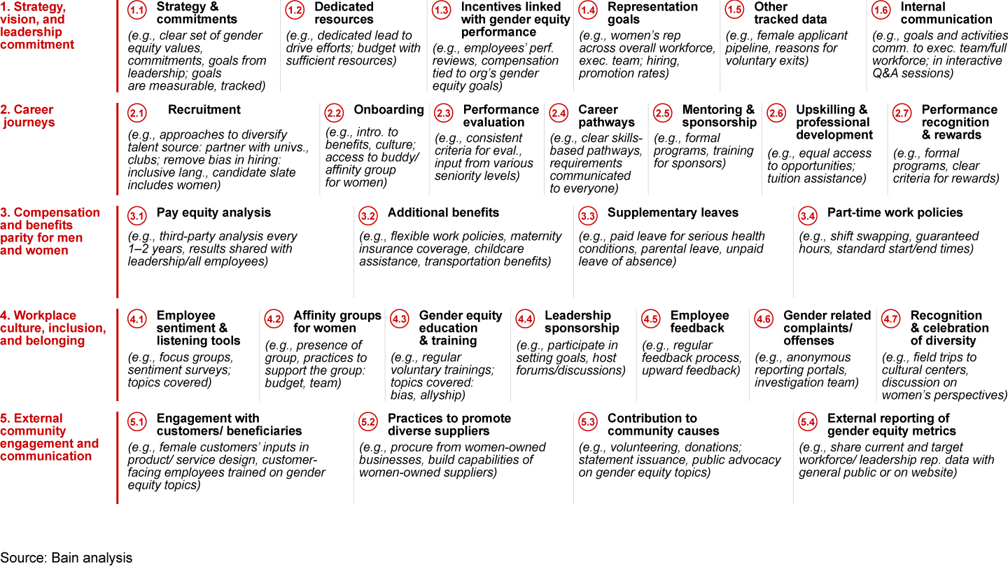 To help organizations navigate their gender equity journey, we have developed an approach rooted in research and experience that helps organizations gain an understanding of their starting point and decide on the best path forward, in terms of practices. This approach encompasses five key pillars: (1) holistic gender equity strategy, vision, and leadership commitment; (2) workplace culture, inclusion, and belonging; (3) talent journey; (4) compensation and benefits; (5) external engagement with customers, suppliers, the community, and governments and clear, measurable goals supported by practical organizational policies and programs.