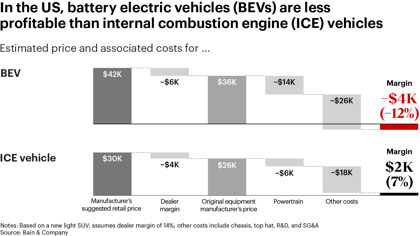 In the US, most auto manufacturers have a big dilemma. Battery electric vehicles (BEVs) remain less profitable than internal combustion engine (ICE) vehicles, even though a BEV model starts at a price point around 35% higher than an equivalent ICE vehicle.