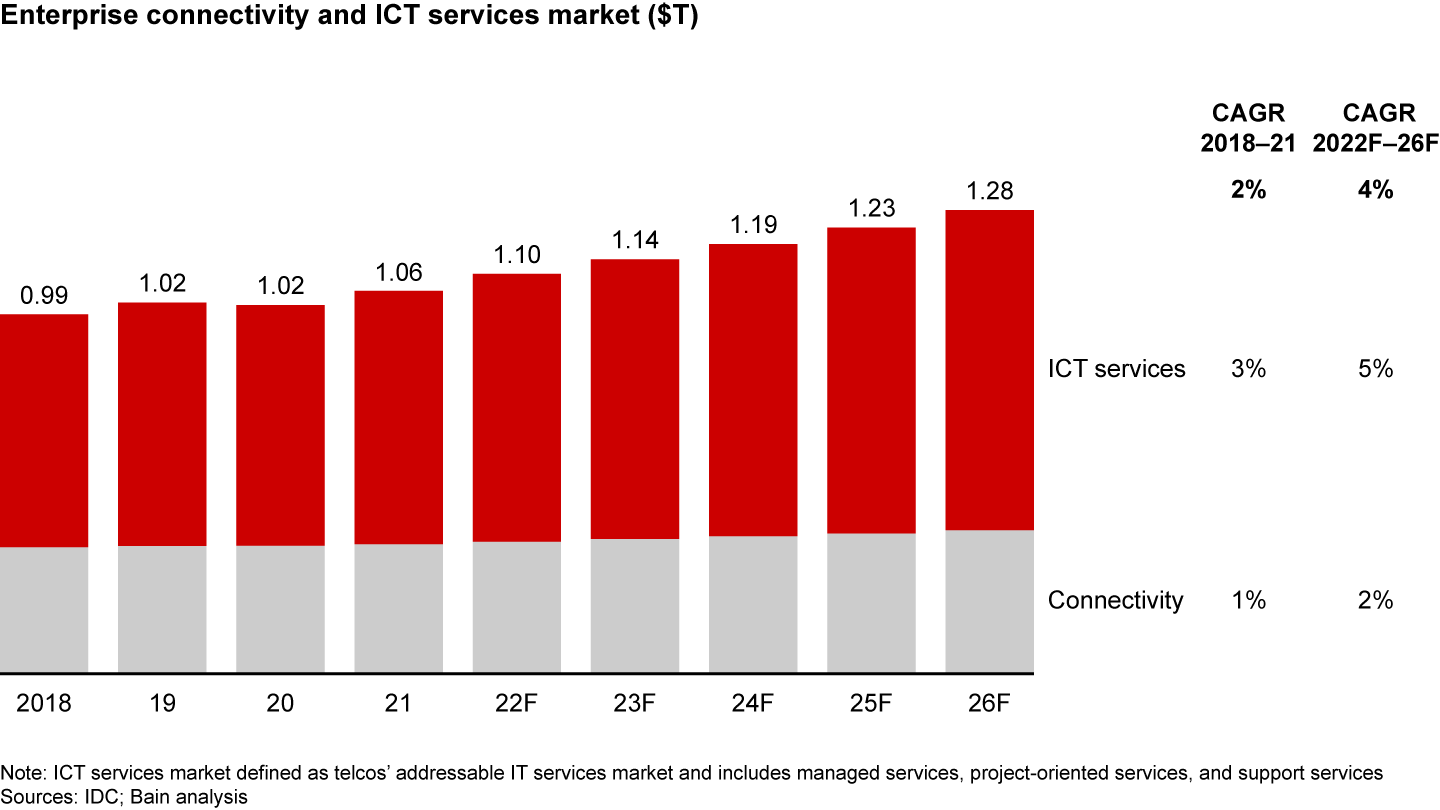 - While the telco connectivity market is flat, the market for enterprise information and communication technology (ICT) services is projected to grow 5% annually through 2026.