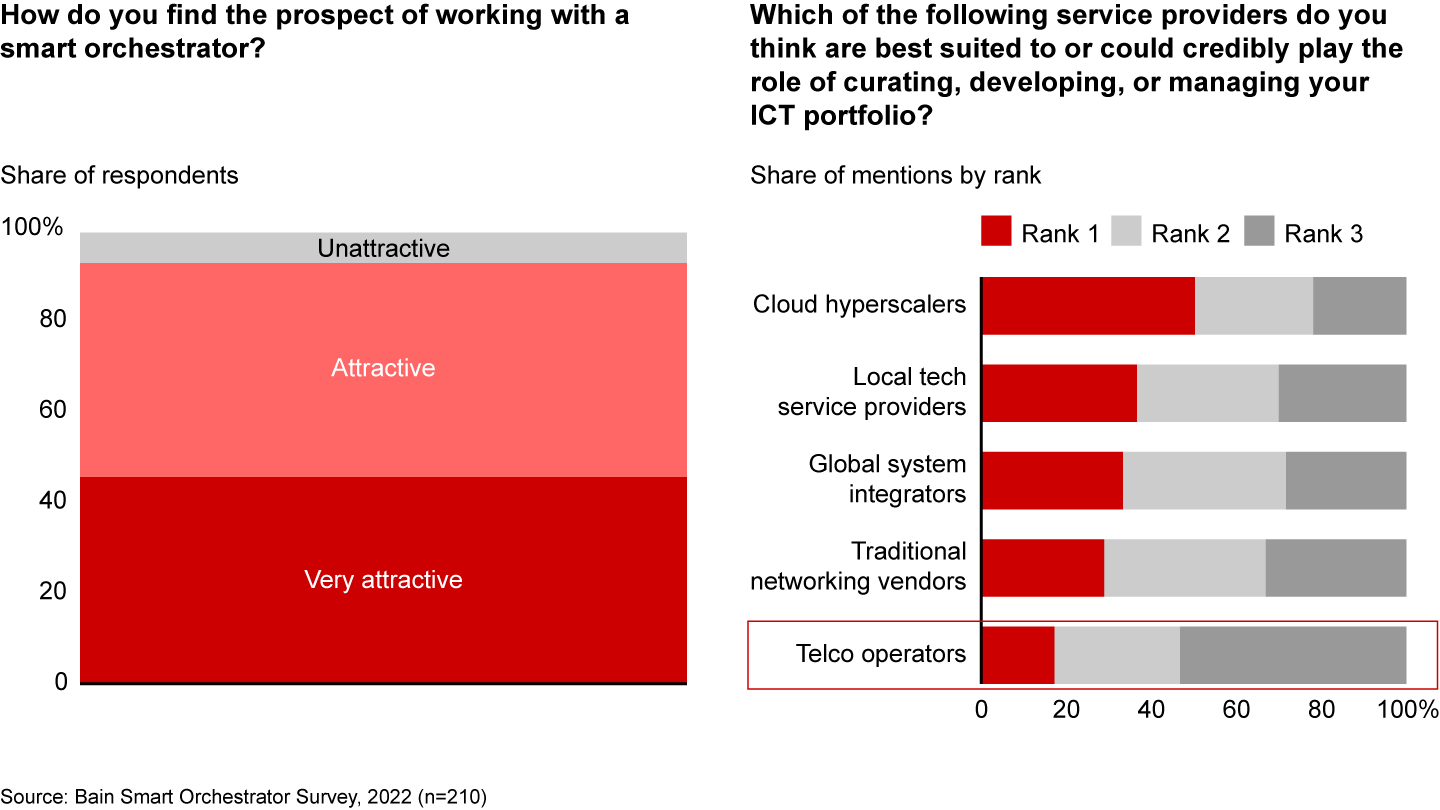About 93% of CIOs and IT buyers find the proposition of hiring a smart orchestrator attractive, according to a 2022 Bain survey. However, telcos ranked last among the types of companies that survey respondents perceived as best suited to fill the role (see Figure 2). So, if telcos are going to seize this opportunity, they’ll clearly have to change what they’ve been doing.